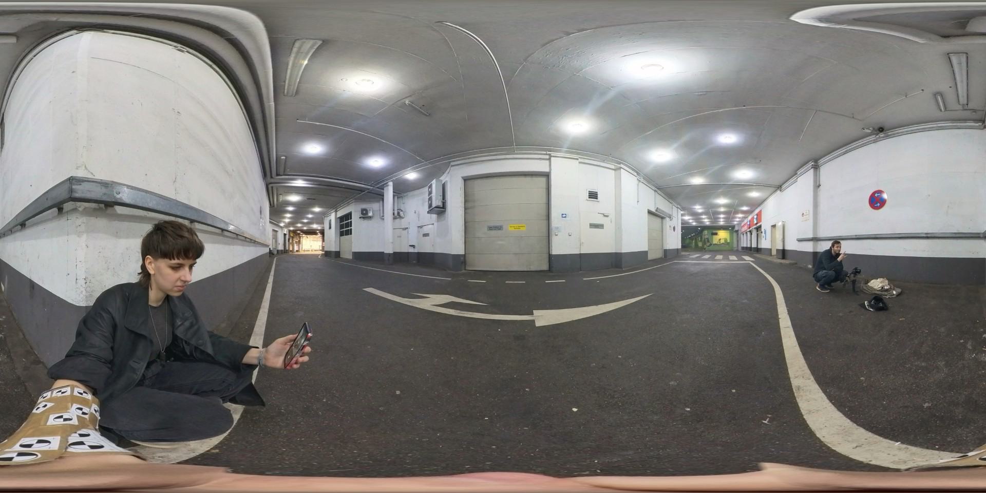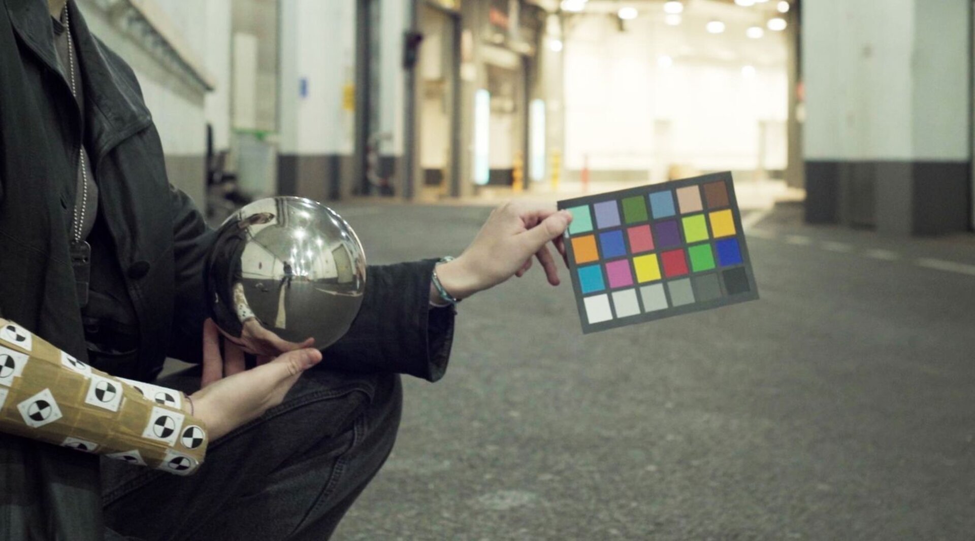Um Licht- und Farbreferenzen aufzunehmen, lieh ich mir eine Chromkugel und eine Color Chart aus der Schule aus. Elena hatte außerdem eine 360°-Kamera, die ich für die HDRI verwenden konnte. Schließlich scannte ich das Set mit Polycam für Licht- und Trackingreferenzen. Um die Armbewegung tracken zu können, trug Elena ein „Trackinggerät“ (im Grunde eine Papprolle mit ein paar Trackingmarkern) über ihrem Unterarm.